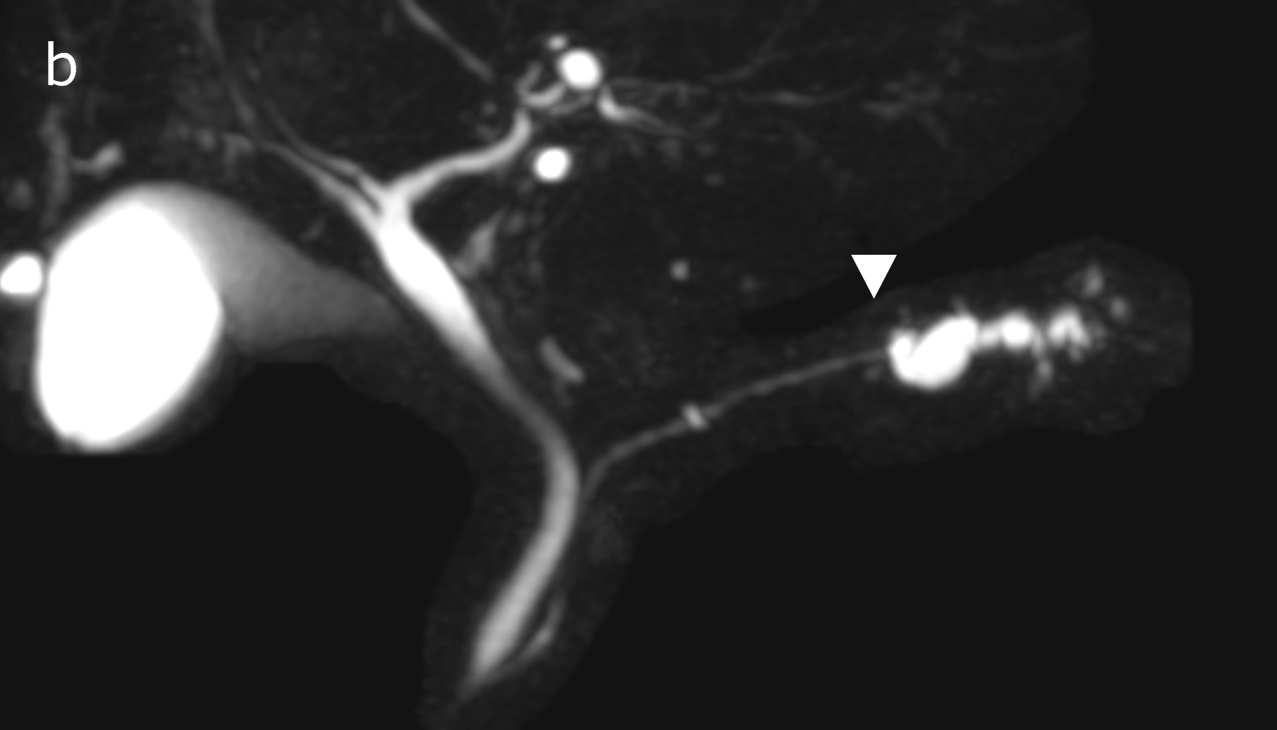 図3(b):MRI(MRCP)(b)では膵尾部の主膵管が白矢印の部位から拡張している。