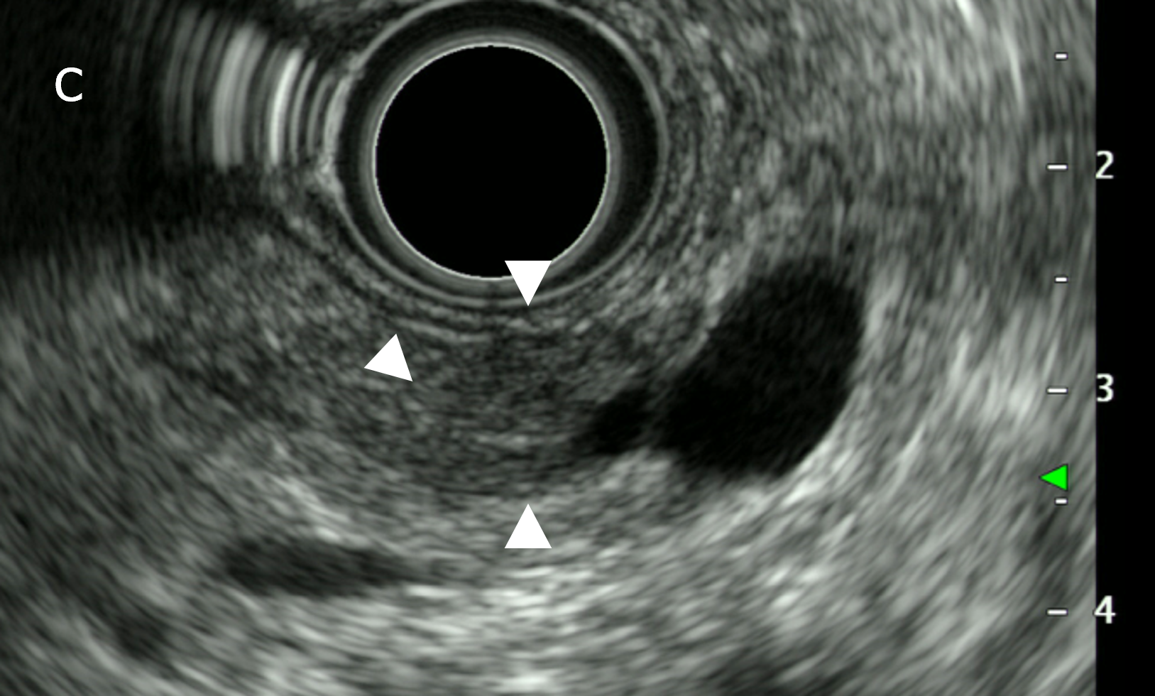 図3(c):EUS(c)では、主膵管の拡張がはじまる部位の周囲に淡い低エコー領域(白矢印)を認める。以上から、強く早期の膵癌を疑い、複数回の膵液細胞診を行い腺癌と診断、手術ののち膵上皮内癌と最終診断された。