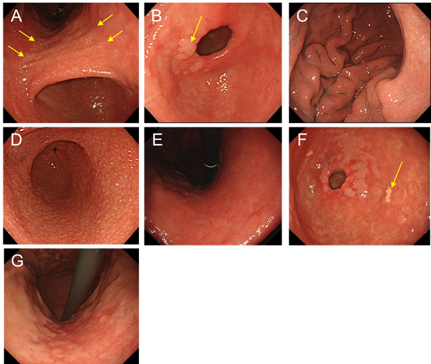 さらに、現在ではピロリ菌の現感染の方と既感染の方の中で、胃がんになりやすい方の内視鏡の特徴が明らかになりつつあります。特に、胃粘膜萎縮(図1A)、腸上皮化生(図1B)、鄒壁腫大(図1C)、鳥肌胃炎(図1D)、びまん性発赤(図1E)、黄色腫(図1F)といった所見を持った方は胃がんの発症の危険性が高いため注意が必要と考えられています。また、除菌治療をした方にみられる地図状発赤(図1G)という所見も胃がん発症と関連があることが報告されるようになってきました。胃内視鏡検査で胃がんになりやすい人を選定するために、これらの胃内視鏡検査での特徴を総合的に考えて危険性を点数化して評価する”胃炎の京都分類”も開発されています。胃内視鏡検査を受診した方の中で、自分自身の胃がんの危険性について興味がある方は、内視鏡検査や検診の担当医の先生に尋ねてみることをお勧めします。